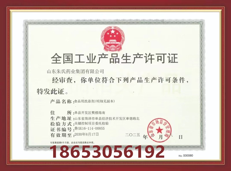 戰(zhàn)略布局再下一城!山東朱氏藥業(yè)集團(tuán)成功獲頒“食品用洗滌劑生產(chǎn)許可證“!