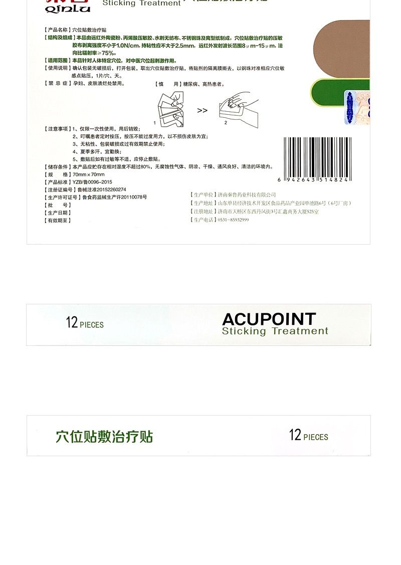 | 使用方法 | 1、清潔相應(yīng)穴位,先以拇指依次揉按相應(yīng)穴位,每穴1~2分鐘,范圍由小到大,力量由輕到重,探尋敏感點(diǎn)。2、確認(rèn)包裝無破損后,打開包裝,取出穴位貼敷治療貼,將貼劑的隔離膜撕去,以鋼珠對準(zhǔn)相應(yīng)穴位敏感點(diǎn)貼壓,1片/穴、天,每日適度按壓3~5次,每次3~5分鐘,1個(gè)療程為10天,療程間隔2~3天。 |