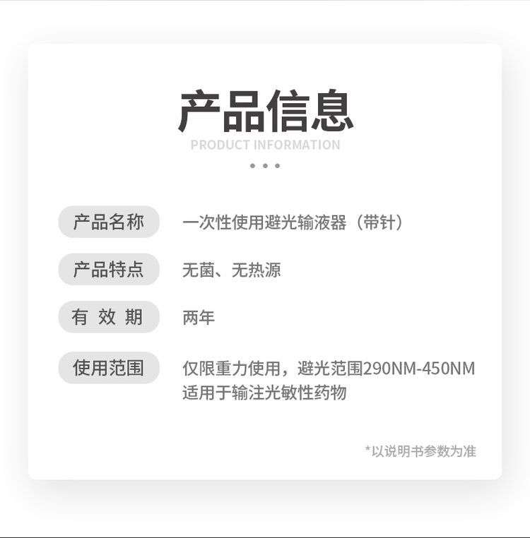 | 產(chǎn)品用途 | 用于臨床靜脈輸注藥物,僅用于重力式輸液。 |