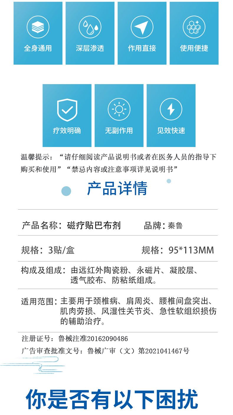 | 補(bǔ)充說明 | [注意事項] 1、僅限一次性使用,用后銷毀; 2、包裝如有破損,嚴(yán)禁使用; 3、使用時嚴(yán)格按照使用說明進(jìn)行; 4、敷貼后無熱感,如有過敏等不適,應(yīng)停止敷貼; 5、防止?fàn)C傷。 [禁忌癥]白細(xì)胞點(diǎn)數(shù)4000以下、體質(zhì)極度衰弱、高熱及重;颊,體內(nèi)置有心臟起搏器者、代償不全的心臟病患者,患有活動性結(jié)核、嚴(yán)重動脈硬化、出血傾向者,患有皮膚病、急性期炎癥患者、皮膚潰瘍處禁用,磁療副作用明顯不能耐受治療者以及孕婦下腹部禁用。 [儲存條件]本產(chǎn)品應(yīng)貯存在相對濕度不超過80%,無腐蝕性氣體、干燥、通風(fēng)良好、清潔的環(huán)境內(nèi)。 |