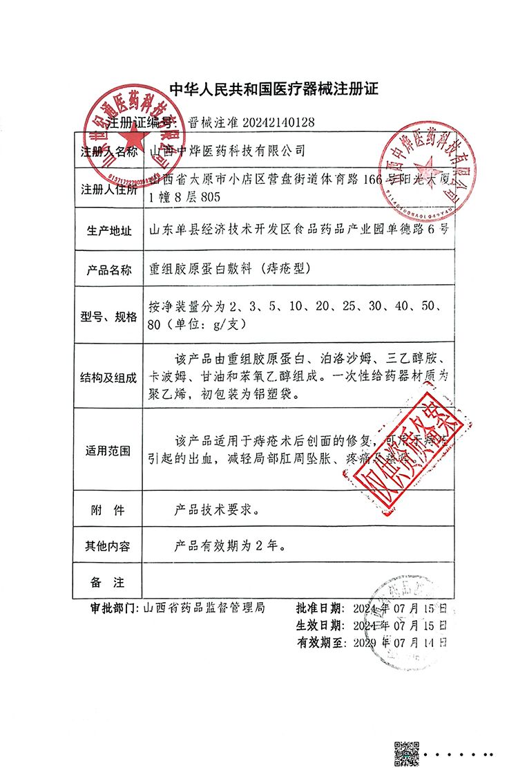 產(chǎn)品名稱: 重組膠原蛋白敷料(痔瘡型)