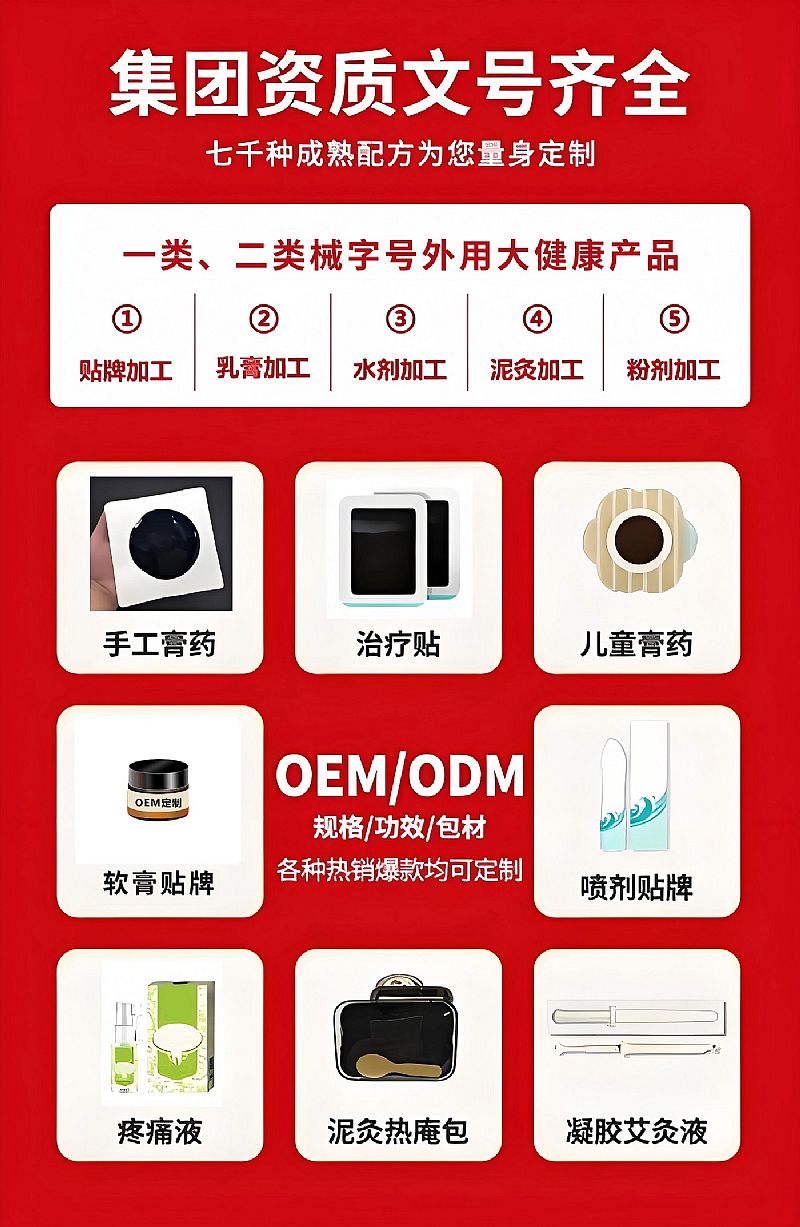產(chǎn)品賣點(diǎn) | 山東九興藥業(yè)膏藥加工廠家,一二類械、健字號(hào)、企業(yè)標(biāo)準(zhǔn),資質(zhì)齊全。專注各類膏藥、穴位貼、小兒貼、三伏貼、理療貼、熱療貼、暖宮貼、疼痛類凝膠等貼牌加工服務(wù),臨床中標(biāo)掛網(wǎng)可醫(yī)保報(bào)銷。支持定制**尺寸、材質(zhì),資質(zhì)齊全,免費(fèi)打樣,一站式服務(wù),幫您打造屬于自己的膏藥品牌!膏藥貼牌加工:15966617905 |