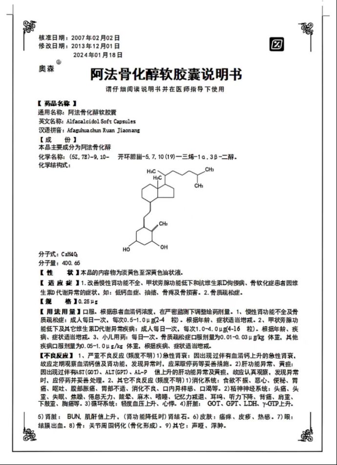 適應(yīng)癥 | 1.改善慢性腎功能不全、甲狀旁腺功能低下和抗維生素D佝僂病、骨軟化癥患者因維生素D代謝異常的癥狀,如:低鈣血癥、抽搐、骨疼及骨損害。2.骨質(zhì)疏松癥。 |