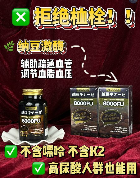 產(chǎn)品賣點(diǎn) | 一般貿(mào)易進(jìn)口,高含量8000FU,以原始的納豆枯草芽孢桿菌發(fā)酵生產(chǎn),去除嘌呤和K2,特別添加亞麻籽油(α-亞麻酸)、紅曲米,地龍蛋白,高純度,不含藥物他汀,******;控銷;不掛網(wǎng); |